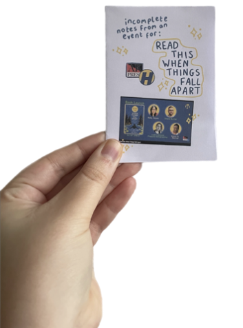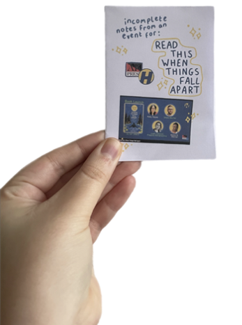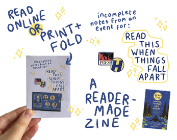 An 8 page zine I made while attending this live event hosted by Haymarket on YouTube on Oct 28 2025 for the book 'Read This When Things Fall Apart: Letters to Activists in Crisis' edited by Kelly Hayes. You can buy a copy of the book through my affiliate link here! (I may earn a commission from Bookshop.org)